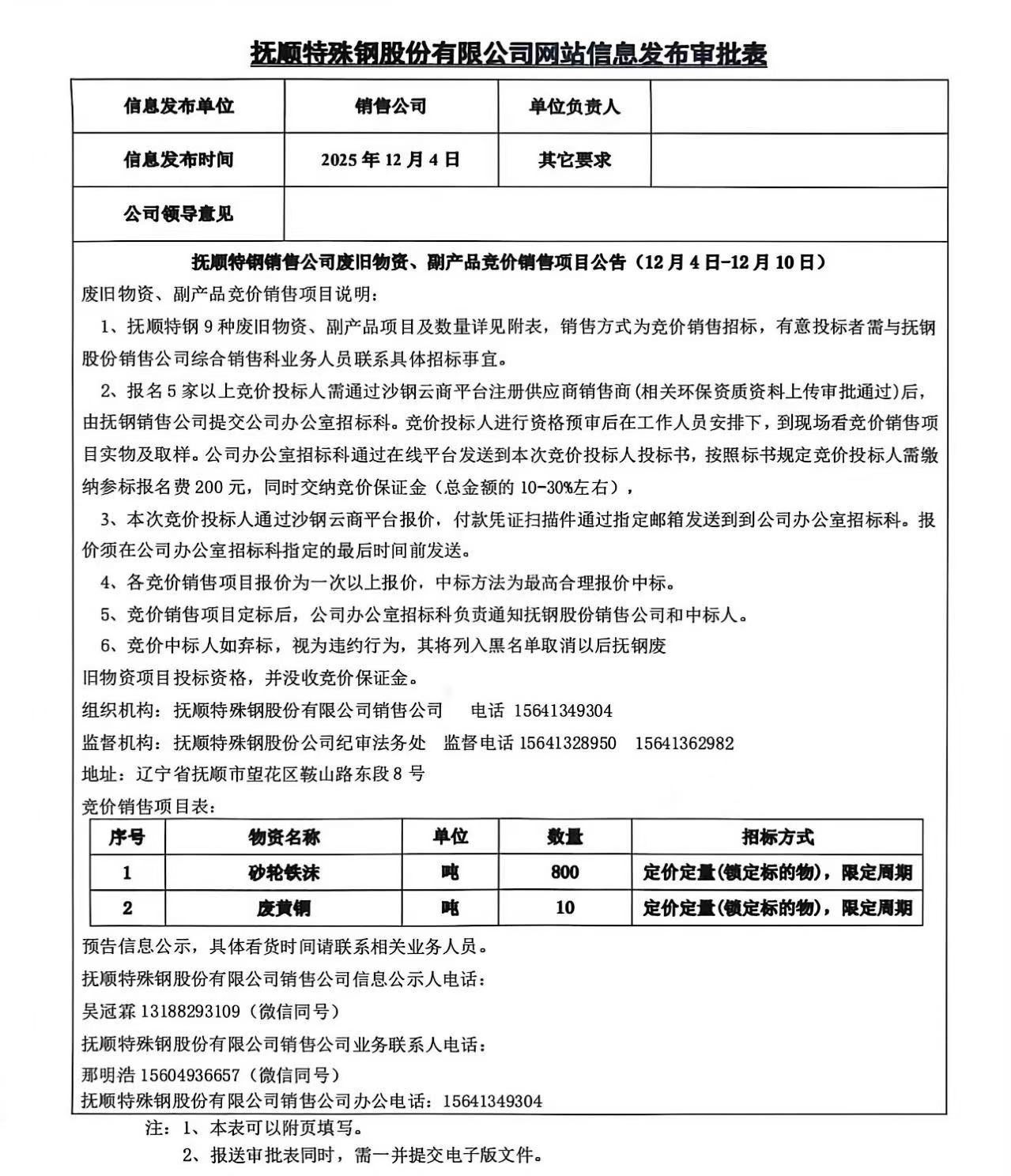 撫順特鋼銷售公司廢舊物資、副產(chǎn)品競價銷售項目公告(12月4日-12月10日)
