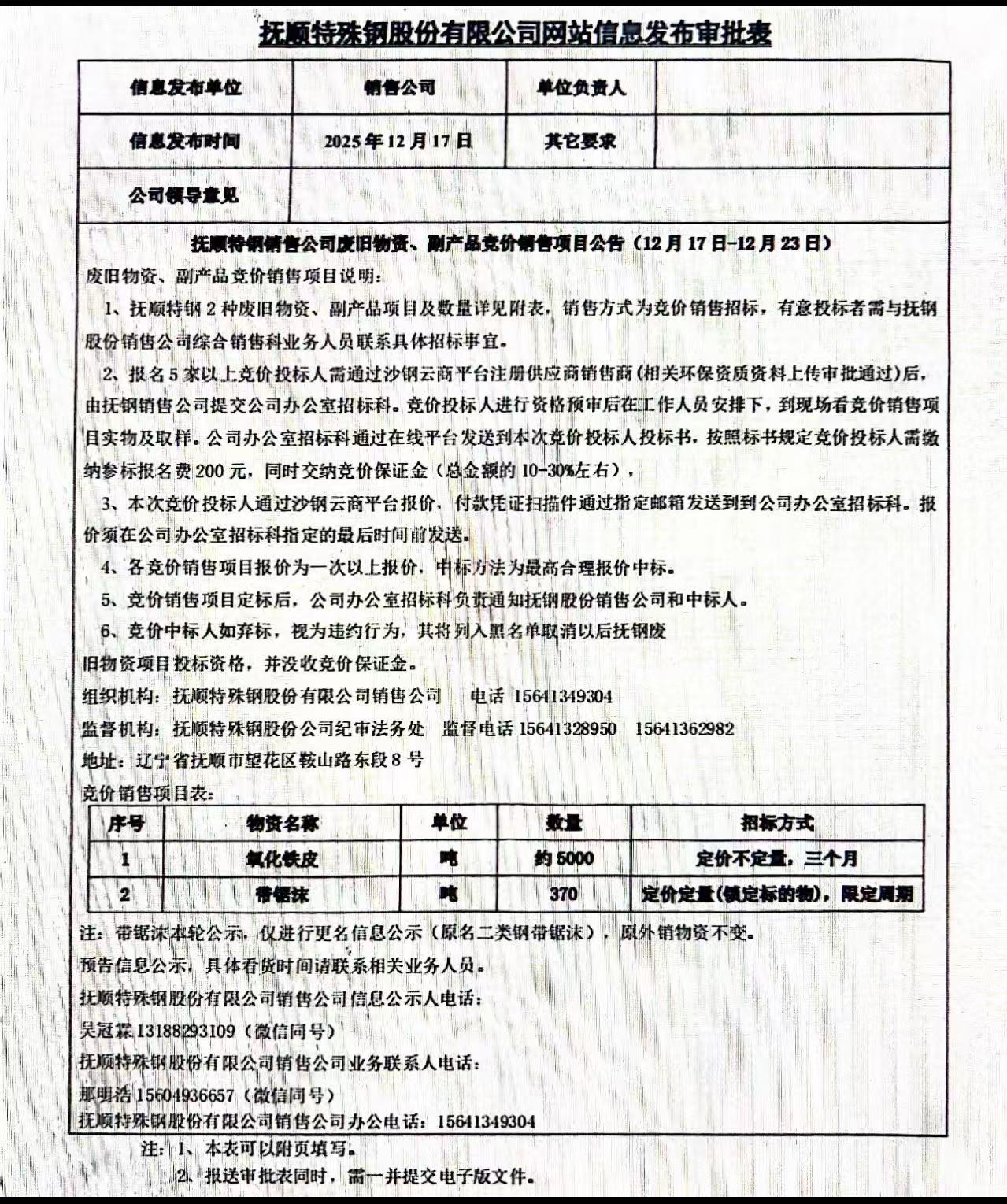 撫順特鋼銷售公司廢舊物資、副產(chǎn)品競(jìng)價(jià)銷售項(xiàng)目公告(12月17日-12月23日)