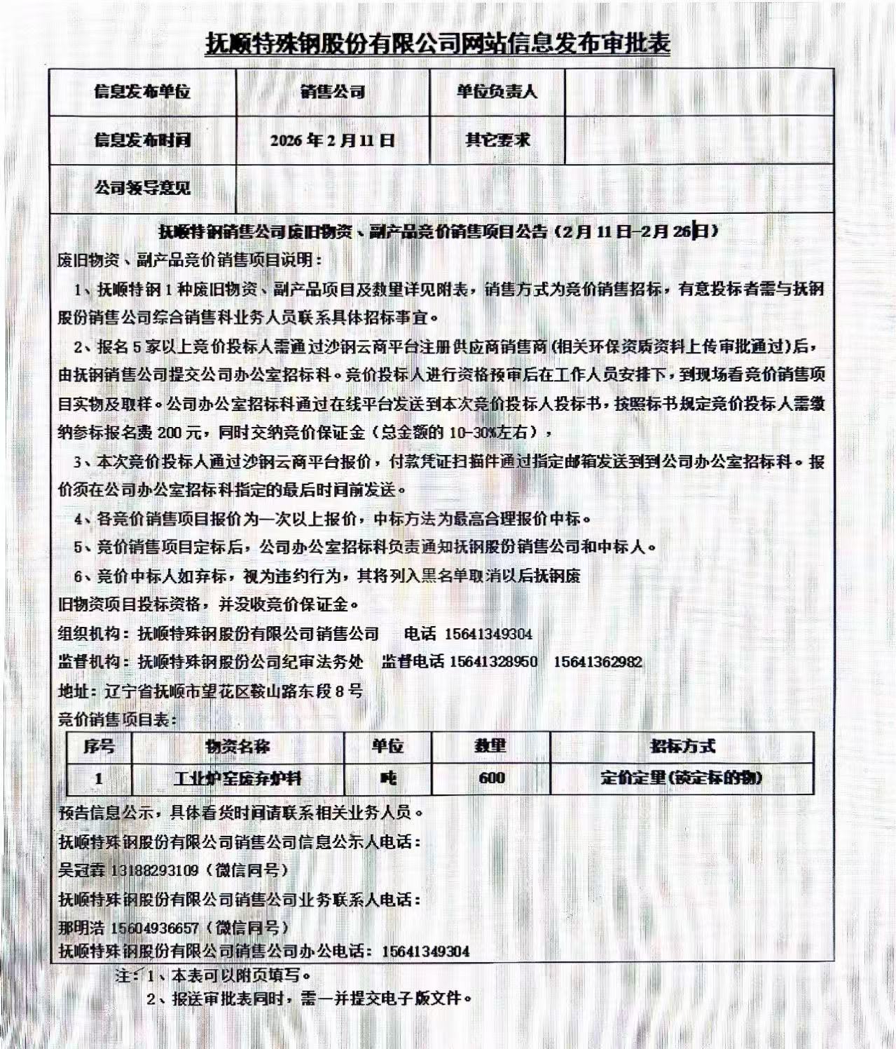 撫順特鋼銷售公司廢舊物資、副產(chǎn)品競價(jià)銷售項(xiàng)目公告(2月11日-2月26日)